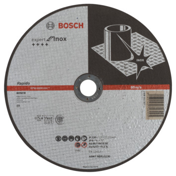 Disque à tronçonner droit Expert pour Inox - Rapido AS 46 T INOX BF, 230 mm, 22,23 mm, 1,9 mm. Disques à tronçonner pour l'acier inoxydable pour des exigences élevées. Convient aux meuleuses d'angle non stationnaires. Vitesse circonférentielle maximale : 80 m/s (selon la vitesse et le diamètre du disque).