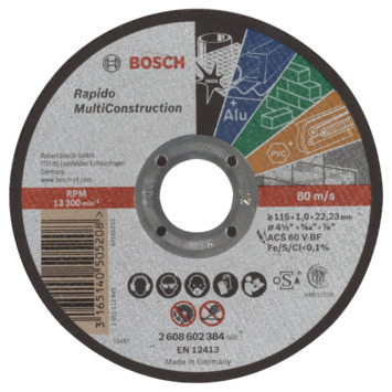 Disque à tronçonner à moyeu plat Rapido Multi Construction ACS 60 V BF, 115 mm, 22,23 mm, 1,0 mm. Pour meuleuses d’angle non stationnaires. Vitesse périphérique maximale : 80 m/s (selon régime et diamètre de disque). Fe/S/Cl <0,1%.