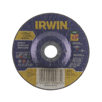 Le disque à tronçonner pour pierre Irwin IW8082144 a un diamètre de 100 mm et une épaisseur de 3 mm. Convient pour tailler la pierre. La meule a un centre en retrait. Convient à toutes les meuleuses d'angle courantes de 100 mm.
