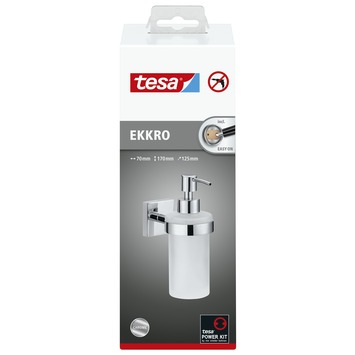 Le distributeur de savon tesa® Ekkro se compose d'une combinaison de métal chromé brillant et de verre satiné. C'est un accessoire de salle de bain beau et pratique. Le montage est très simple grâce à la technologie brevetée tesa® Power.Kit : 1) Collez l'adaptateur sur le mur et remplissez-le avec l'adhésif tesa® Power.Kit 2) Laissez l'adhésif durcir pendant 12 heures 3) Vissez le support sur l'adaptateur et placez le distributeur de savon dans le support. Tous les matériaux nécessaires sont inclus dans l'emballage : pompe à savon, support et kit de montage BK20. Le support peut-être facilement retiré à nouveau sans résidus de colle ni dommages. Vous pouvez le remettre en place avec un jeu d'adaptateurs BK20, qui est également disponible séparément. Convient pour les carreaux, le métal, la pierre naturelle, le marbre, le béton, le bois, le verre et de nombreux types de plastique. Ne convient pas aux papiers peints, stucs et autres surfaces avec un revêtement antiadhésif. Divers accessoires sanitaires sont disponibles dans cette série Ekkro, pour un look complet. Donnez un nouveau style à vos toilettes ou votre salle de bain avec Ekkro.