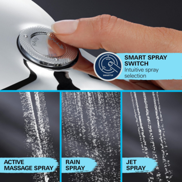 Plaque de pulvérisation blanche GROHE Rain avec DripStop, Jet avec DripStop, ActiveMassage GROHE EcoJoy 9,5 l/min. Limiteur de débit GROHE DreamSpray pour un jet optimal GROHE SmartTip choisissez le type de jet souhaité avec une seule buse GROHE RainStart