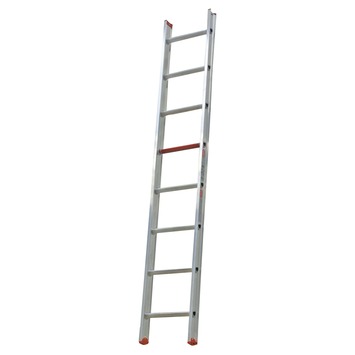 Eenvoudige rechte ladder, goed afgewerkt met rubber voetsteunen, met ruime breedte voor goede stabiliteit, ideaal om kelderhoogte te overbruggen.