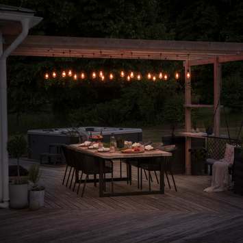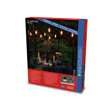 Faites de toutes les activités (extérieures) une fête réussie tout au long de l'année avec ce cordon d'éclairage de fête élégant et attrayant de la marque suédoise haut de gamme Konstsmide. Ce cordon lumineux PowerLED de 10 lampes et 10 m de long est doté d'ampoules en acrylique Edison résistantes aux UV et d'une belle et puissante couleur de lumière atmosphérique blanc extra chaud. Ce cordon complémentaire ne peut être utilisé qu'en combinaison avec un cordon de démarrage Konstsmide de 10 m de longueur, type 2351-800. Au total, un maximum de 3 câbles supplémentaires d'une longueur de 10 m, type 2352-800, peuvent être connectés à 1 câble de démarrage, jusqu'à un maximum de 40 m de longueur de câble lumineux. Les sources lumineuses PowerLED, puissantes mais attrayantes, sont économes en énergie et puissantes. Si une source lumineuse tombe en panne, vous pouvez facilement la remplacer. Le cordon peut résister aux conditions météorologiques scandinaves extrêmes et résiste sans effort aux températures élevées et basses. Les ampoules Edison sont très bien isolées contre la pénétration de l'eau. Le transformateur et le câble de connexion ne sont pas inclus. Ceux-ci font partie du cordon de démarrage 2351-800. Le cordon est équipé de crochets de suspension intégrés. Cela rend le cordon facile à accrocher. Le cordon fonctionne sur le transformateur extérieur 24 V approuvé IP44 du cordon de démarrage et possède une marque de sécurité européenne et est donc totalement sûr à utiliser. Les sources lumineuses LED durent au moins 20 000 heures, soit au moins 20 ans avec une utilisation quotidienne de 3 heures. Les sources lumineuses LED enfichables ont une couleur très homogène et présentent une perte de puissance minimale au cours de leur durée de vie. Le transformateur du cordon de démarrage dispose d'un variateur intégré avec lequel la sortie de ce cordon supplémentaire peut également être activée à 100%, 75%, 50% ou 25%. Le variateur a une fonction de mémoire, donc après une interruption de l'alimentation électrique, le variateur reprend avec le dernier réglage réglé. Le variateur est également l'interrupteur marche/arrêt. Le cordon peut être utilisé aussi bien à l'intérieur qu'à l'extérieur et apporte une touche chaleureuse et festive lors d'occasions spéciales telles qu'un barbecue, une garden-party, une Coupe du monde/EC, une fête de remise des diplômes, un anniversaire, une pendaison de crémaillère, une fête de mariage, une baby shower, une fête de maternité et peut être accroché dans le jardin, la terrasse, la véranda, la tente de fête ou le balcon, la pergola, le parasol, l'auvent ou la cloison. En période hivernale, ce cordon est idéal pour éclairer les arbres et arbustes. La distance entre les lampes est de 100 cm. Un maximum de 3 cordons supplémentaires peuvent être connectés à 1 cordon de démarrage de 10 m, vous pouvez donc choisir une longueur de cordon de 10, 20, 30 ou 40 m. Avec ce cordon lumineux de Konstsmide vous optez pour une qualité premium et une ambiance optimale !