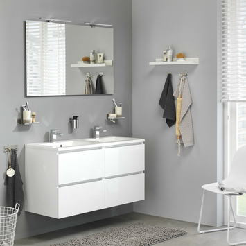 Le bon éclairage complète votre salle de bain. Vous aimez l'élégance et la modernité ? Optez alors pour l'éclairage miroir Aurel 4061 LED. Cette lampe mesure 45 cm de large et, grâce à la classe de protection IP44, elle est protégée contre les éclaboussures. Elle est donc idéale pour être suspendue au-dessus du miroir de votre salle de bain. Le boîtier est en plastique, un matériau léger et surtout résistant à l'humidité. Sa finition chromée donne à la lampe un look moderne et industriel. La lampe est équipée d'un éclairage LED intégré et a une couleur de lumière de 4000K, ce qui signifie que la lampe a une couleur blanche froide qui est approximativement égale à la lumière du jour. De plus, la lampe est dimmable, vous décidez donc de la luminosité de votre salle de bain. En bref : une lampe minimaliste qui s'intègre dans toutes les salles de bains modernes.