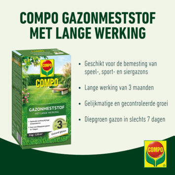 Engrais pour pelouse à action prolongée de 3 mois, idéal pour les pelouses ornementales, sportives et de jeux. Les nutriments sont libérés progressivement, adaptés aux besoins de l’herbe, ce qui empêche le lessivage vers les eaux souterraines. Cela assure une croissance uniforme et contrôlée. Grâce au potassium supplémentaire, votre pelouse gagne en résistance à la sécheresse et au gel.