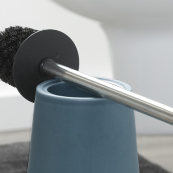 Le manche de la brosse WC est en finition chromée très tendance et le support en céramique bleu mat se place là où vous voulez près de votre cuvette WC. Évitez que l'eau ne stagne au fond du support et rincez-le régulièrement pour une meilleure hygiène. Cette série comprend plusieurs accessoires pour la toilette et la salle de bain et est également disponible en vert mat.