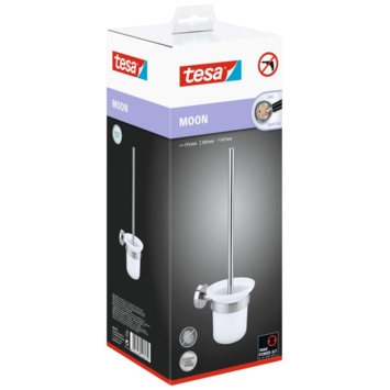 L'ensemble brosse de toilette tesa® Moon est pratique et beau avec sa finition en acier inoxydable avec anti-empreintes digitales et verre satiné. La brosse économise de l'espace car elle est fixée au mur. L'installation est très simple grâce à la technologie brevetée tesa® Power.Kit : 1) Collez l'adaptateur au mur et remplissez-le avec la colle tesa® Power.Kit 2) Laissez ensuite la colle durcir pendant 12 heures 3) Vissez le porte-brosse WC sur l'adaptateur. Tous les matériaux nécessaires sont inclus dans l'emballage : un ensemble brosse WC et un kit de montage. Si nécessaire, le porte-brosse WC pourra être retiré facilement et sans résidus de colle ni dommages. Vous pouvez le rattacher avec le jeu d'adaptateurs BK20, qui peut également être acheté séparément. Convient pour les carreaux, le métal, la pierre naturelle, le marbre, le béton, le bois, le verre et de nombreux types de plastique. Ne convient pas aux papiers peints, stucs et autres surfaces non adhésives. La série Moon se compose de divers accessoires. Voir toute la gamme pour un look complet.