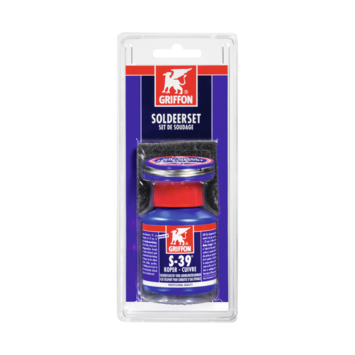 Le kit de soudure Griffon Blister est un kit de soudure complet. Cet ensemble convient aux conduites d'eau (potable) en cuivre à braser tendre, aux conduites de chauffage central et aux conduites de gaz avec des raccords en cuivre ou en laiton d'un diamètre allant jusqu'à 22 mm. L'ensemble se compose d'une soudure sans plomb, d'une pâte à souder, d'une brosse et d'une fibre abrasive. Avec cet ensemble, vous obtenez tous les outils de base essentiels pour souder.