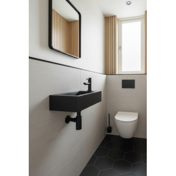 Cet ensemble est le choix idéal si vous disposez de peu d'espace mais souhaitez tout de même un ensemble homogène. Le mini Ondine S noir mat a un design moderne et est de format compact. Le trou pour le robinet et le plateau se trouvent à droite. Il est fabriqué en céramique et a des angles intérieurs arrondis, ce qui facilite son nettoyage. Le robinet de toilette fourni est petit, mais grâce à sa longue poignée, il est facile à utiliser. Le siphon et la bonde sont également noirs mats et s'accordent parfaitement avec le reste. La bonde est fixe et reste toujours ouverte, ce qui la rend adaptée aux modèles sans trop-plein. Tous les éléments s'harmonisent parfaitement en termes de couleur et de forme. Vous le fixez au mur avec le kit de fixation fourni. Une solution complète et élégante.