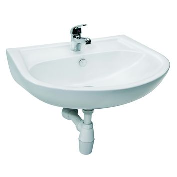 Pas de toilettes sans lave-mains. Cet ensemble Hebe se compose d'un robinet chromé classique, d'un lavabo blanc arrondi en porcelaine et d'un siphon en plastique. L'ensemble est classique et raffiné.