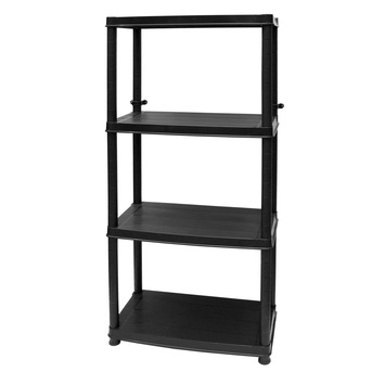 GAMMA propose de pratiques étagères en divers matériaux : bois, métal et plastique. Suivant le matériau, vous pouvez plus ou moins charger l'étagère. Cette étagère en plastique noir comprenant 4 tablettes peut supporter 30 kilos.