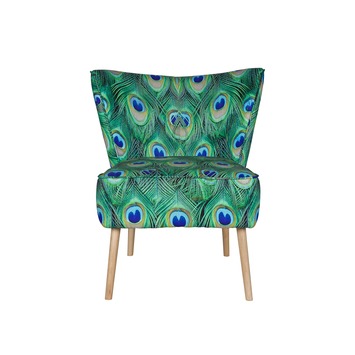Ceux qui aiment les (plumes de) paons vont adorer ce fauteuil vert-bleu de Woood. Il est recouvert d’un tissu 100% coton avec un imprimé de paon très original et a des pieds en bois de hêtre. La découpe du tissu fait de chaque fauteuil un modèle unique au monde