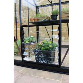 La fenêtre à persiennes 6 lamelles enduites de noir pour serre Qube mesure 610 x 610 mm. Une fenêtre à persiennes est une fenêtre à lattes, un ajout à la ou aux lucarnes déjà présentes dans la véranda. Cette fenêtre à persiennes est équipée de 6 lames de verre de sécurité qui peuvent être ouvertes en position horizontale, ou superposées en position verticale, fermant ainsi la fenêtre.