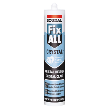 Le produit le plus polyvalent de Soudal est Fix All. Ce mastic adhésif vous permet de tout étanchéifier et coller. Faites votre choix entre Fix All Crystal, Flexi, High Tack ou Turbo. Fix Crystal a les mêmes caractéristiques que Fix All Flexi et est en plus 100% transparent.