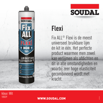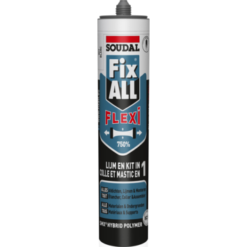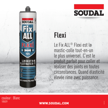 Le produit le plus polyvalent de Soudal est Fix All. Ce mastic adhhésif vous permet de tout étanchéifier et coller. Faites votre choix entre Fix All Crystal, Flexi, High Tack ou Turbo. Fix All Flexi est la colle la plus élastique qui soit. Le produit est parfait pour l’étanchéisation et le montage de différents matériaux de construction, sur toutes les surfaces et dans toutes les conditions. Disponible en différentes couleurs dont le blanc.