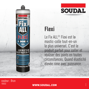 Le produit le plus polyvalent de Soudal est Fix All. Ce mastic adhésif vous permet de tout étanchéifier et coller. Faites votre choix entre Fix All Crystal, Flexi, High Tack ou Turbo. Fix All Flexi est le mastic adhésif le plus élastique de la gamme. Le produit est parfait pour l’étanchéisation et le montage de différents matériaux de construction, sur toutes les surfaces et dans toutes les conditions. Disponible en différents coloris, dont le brun.