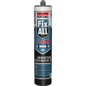 Le produit le plus polyvalent de Soudal est Fix All. Ce mastic adhhésif vous permet de tout étanchéifier et coller. Faites votre choix entre Fix All Crystal, Flexi, High Tack ou Turbo. Fix All Flexi est le mastic adhésif le plus élastique de la gamme. Le produit est parfait pour l’étanchéisation et le montage de différents matériaux de construction, sur toutes les surfaces et dans toutes les conditions. Disponible en différents coloris, dont le gris.