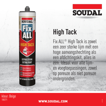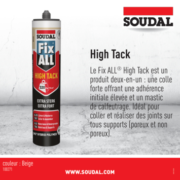 Le produit le plus polyvalent de Soudal est Fix All. Ce mastic adhésif vous permet de tout étanchéifier et coller. Faites votre choix entre Fix All Crystal, Flexi, High Tack ou Turbo. Fix All High Tack est une colle en kit super solide avec une adhérence initiale très élevée. Le produit est parfait pour l’étanchéisation et le montage de différents matériaux de construction lourds, sur toutes les surfaces et dans toutes les conditions. Disponible en différents coloris, dont le beige.