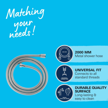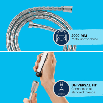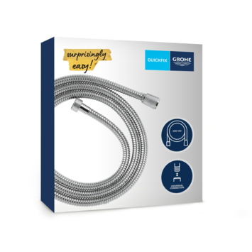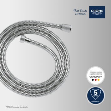 Avec une longueur de 200 cm, le flexible de douche est idéal pour un système de douche ou un set de douche. Bien sûr, il s'adapte également à toutes les douchettes à main et mitigeurs standard. Ce flexible de douche robuste peut supporter une pression d'eau jusqu'à 5 bars, une tension jusqu'à 50 kg et une chaleur jusqu'à 70°C. Le flexible de douche Grohe VitalioFlex Metal est facile à entretenir et offre une belle brillance chromée.
