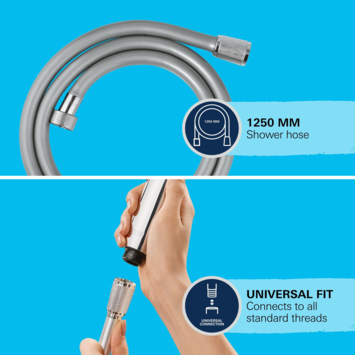 Vous pouvez facilement connecter le tuyau de douche avec les raccords standard de 1/2". Les écrous de connexion en métal sont finis avec une couche de chrome brillant et munis de nervures pour une bonne prise en main. Ce flexible de douche robuste et durable peut supporter une pression d'eau jusqu'à 5 bars, une tension jusqu'à 50 kg et une résistance à la chaleur jusqu'à 70°C.
