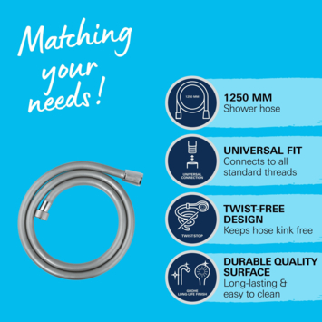 Le flexible de douche est équipé d'un raccord pivotant pour la fonction Twistfree et est donc facile à utiliser. Le tuyau de douche ne se plie pas et vous ne souffrez pas de plis. Grâce à sa surface lisse, le tuyau de douche est facile à nettoyer avec un chiffon sec et possède une couche anti-rayures. Le flexible de douche VitalioFlex n'endommage pas la cabine de douche ni la baignoire.