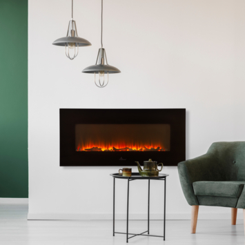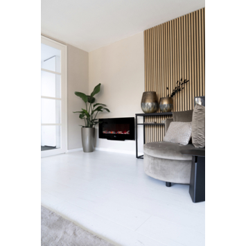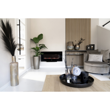 La foyer d’ambiance Livn Brixham est chauffage suspendu noir droit avec un jeu de flammes réaliste LED 3D, un rétroéclairage avec 14 options de couleurs et 2 réglages de chaleur (1000 et 2000 W). Le chauffage est intégré en bas du foyer, de sorte que le foyer puisse également être monté sous une télévision. Le chauffage est livré avec la télécommande. De plus, il est fourni avec des bûches et des galets. Vous pouvez donc choisir si vous préférez des blocs de bois ou des galets. Un large foyer électrique avec un beau design intemporel et moderne. Ce poêle est le successeur du foyer suspendu Brighton et possède une image de flamme et un lit de flammes encore plus réalistes que son prédécesseur, un rétroéclairage avec 14 options de couleurs et un affichage numérique intégré dans la cheminée, qui apparaît temporairement lorsqu'il est activé par la télécommande.