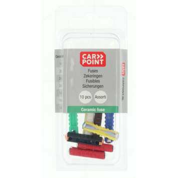 Emballage d'assortiment Carpoint avec fusibles en pierre et fusible radio. L'ensemble se compose de douze fusibles de brique différents avec un fusible jaune 5, quatre blancs 8, deux bruns 10, trois rouges 16, un bleu 25 et un fusible noir de 40 ampères. Avec un fusible radio de 2 A. Remplacez toujours le fusible brique cassé par un fusible de même valeur ou couleur. Les fusibles sont fournis sous blister.