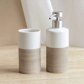 Les accessoires Doppio de Tiger parachèvent votre salle de bains et/ou toilette à la perfection. Les accessoires ont un look unique grâce à la combinaison de porcelaine blanche et colorée avec d’un côté une structure plate et de l’autre, une structure brossée. Faites votre choix parmi les nombreux accessoires, comme ce gobelet avec un accent de couleur blanc cassé.