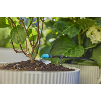 Utilisez le goutteur d'extrémité réglable Gardena 0–15 L/h pour arroser de manière sélective des plantes en pot, des herbes ou des rangées de plantes dans le système Micro-Drip. Vous pouvez utiliser le goutteur d'extrémité pratique à l'extrémité du tube d'alimentation de 4,6 mm ou le visser dans le tube de couplage de 13 mm après avoir percé le tube avec l'outil d'assemblage. Réglez le débit d'eau du goutteur entre 0 et 15 litres par heure. Vous pourrez ainsi l'adapter aux différents besoins en eau des plantes de votre jardin, sur la terrasse ou sur le balcon. Le goutteur d'extrémité fonctionne très bien avec les arbres en pot à fort besoin en eau. Les plantes sensibles en particulier en profitent beaucoup. L'installation est facile et simple, grâce à la technologie de couplage intelligente Easy & Flexible. Vissez la partie MDS, étendez-la de manière flexible ou déconnectez-la facilement du tuyau d'alimentation ou du tuyau de raccordement.