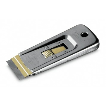 Corps métallique avec lame rétractable. Pour enlever les restes de colle, de peinture, etc. sur le verre. Avec 5 lames de rechange. Lames de rechange 0-28-510 et 1-11-515 disponibles séparément