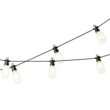 Avec cet amusant éclairage de fête Mason sur cordon, vous pouvez créer une atmosphère chaleureuse dans votre jardin, sur le balcon ou simplement dans votre chambre. Ils ont un indice de protection IP44 et sont donc résistants aux éclaboussures, très adaptés à une utilisation en extérieur. Le cordon d'alimenation mesure 5 mètres sur une longueur totale de 9,5 mètres. L'espacement entre les 10 lumières est de 50 cm. Leur lumière blanc chaud donne immédiatement une atmosphère agréable à votre espace (extérieur). Cet éclairage est équipé d'ampoules LED.