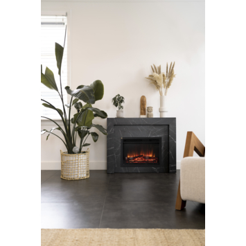 L'habillage de cheminée Livn Bregenz s'intègre parfaitement dans un intérieur moderne. Le boîtier est en aggloméré avec un placage effet marbre. Outre cette version en marbre blanc, vous pouvez également opter pour l'effet marbre noir. L'habillage de la cheminée peut être combiné avec le foyer encastrable électrique Lugano.