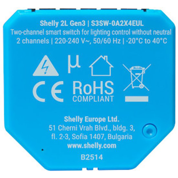 L'interrupteur intelligent Shelly 2L Gen3 WiFi (2 canaux) permet de contrôler deux points lumineux séparément. Il n'est pas nécessaire d'avoir un fil neutre, ce qui rend ce module également adapté aux maisons anciennes. Il se place derrière un interrupteur existant et vous pouvez contrôler les lampes via WiFi, Bluetooth ou manuellement.