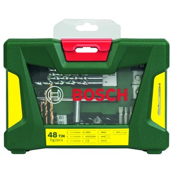 Le jeu d'accessoires 48 pièces V-line Bosch comprend les ustensiles nécessaires pour tous vos travaux de forage et vissage dans le bois, le métal et la pierre. Les mèches, embouts, poignées et clé anglaise sont bien ordonnés dans un coffret solide.
