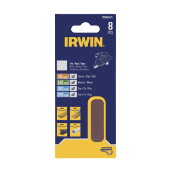 Le jeu de 8 bandes abrasives Irwin IW8083215 contient 8 feuilles de différents grains : 2 bandes grossières G80, 2 bandes moyennes G120, 2 bandes fines G180 et 2 bandes très fines G240 pour les ponceuses multi Black+Decker KA270, KA272, KA280, BEW200. A fixation velcro.