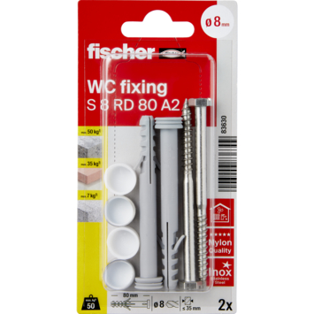 Le kit de fixation fischer pour lavabo WC S8 RD 80 K contient tous les composants pour une fixation sûre des WC indépendants : 2 chevilles universelles fischer UX 8 x 60 R en nylon de haute qualité, 2 vis à bois en laiton 6 x 85 à tête hexagonale tête et 2 capuchons blancs et chromés chacun.