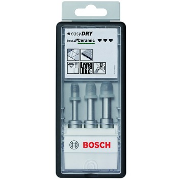 Le foret diamanté Easy Dry permet un perçage à sec facile dans la céramique. Son réservoir de liquide de lubrification intégré permet des performances régulières, tandis que ses diamants robustes et résistants à l'usure appliqués par brasage sous vide facilitent le travail. Par ailleurs, sa longueur utile de 33 mm permet de percer facilement des trous dans des carreaux de toutes les épaisseurs. Ce produit est destiné à différents matériaux, des carreaux muraux tendres aux carreaux de sol très durs comme le grès cérame fin.