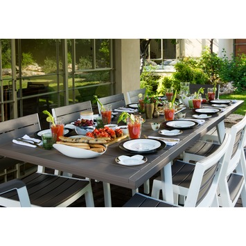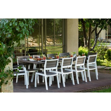 L'ensemble de jardin Harmony de chez Allibert dégage une impression d'élégance intemporelle de par l'association d'un plastique blanc et cappuccino, facile à entretenir. La table est extensible, ce qui permet d'y asseoir agréablement 6 à 10 personnes. L'idéal pour les grandes familles ou les groupes d'amis.