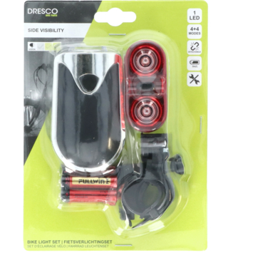 Un bon éclairage de vélo à l'avant et à l'arrière du vélo est indispensable pour voir et être vu. Le set d'éclairage Dresco LED est un set complet avec un phare avant et un feu arrière. Le feu avant a une LED blanche puissante. Les côtés gauche et droit du feu avant ont une LED bleue. Le phare a trois fonctions différentes : allumé/clignotant/éteint où la lumière continue a deux modes d'éclairage différents. Le phare avant peut être monté sur le guidon sans outils, la lampe peut être retirée du support à la destination. Cela signifie que la lampe frontale peut également être utilisée comme lampe de poche. Le feu arrière a deux LED et quatre fonctions différentes : marche/2 x clignotants/arrêt. Le feu arrière compact est facile à fixer à la tige de selle ou à la fourche arrière avec le support fourni, le feu arrière peut également être retiré du support. Les feux avant et arrière fonctionnent avec les 5 piles AAA/LR03 incluses. 3 piles pour le feu avant et 2 piles pour alimenter le feu arrière.
