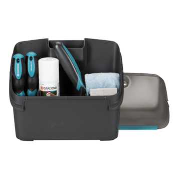 Le kit d’entretien Gardena pour tondeuse robot comprend une éponge de nettoyage, deux brosses différentes, un spray de nettoyage et un tournevis spécial, pour remplacer vous-même la lame, par exemple.