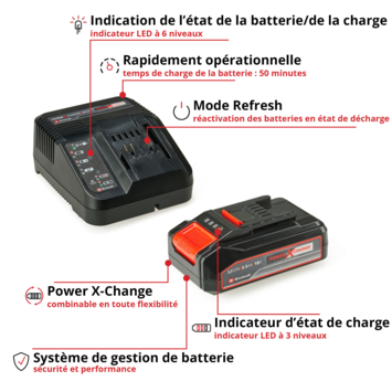Le kit de démarrage Power X-Change 18 V 2,5 Ah Einhell est idéal pour commencer ou étendre sa collection d’outils Power X-Change. Ce kit starter est composé d’une batterie Power X-Change 18 V 2,5 Ah et d’un chargeur rapide fait partie de la gamme de batteries Power X-Change multifonctions et totalement interchangeables de Einhell. Les batteries universelles Power X-Change puissantes et durables alimentent tous les appareils sans fil de cette gamme de produits utilisés pour les travaux de jardinage et de bricolage. Les chargeurs de la gamme sont aussi universellement compatibles avec toutes les batteries Power X-Change. Les bénéfices pour le client sont évidents : avec un système universel de batterie et chargeur compatible avec tous les appareils, on réalise des économies importantes à l’achat, on préserve l’environnement et on gagne en flexibilité pour les travaux dans la maison et au jardin. On évite en outre le désordre occasionné par l’utilisation de batteries et chargeurs multiples pour un seul et même appareil. La batterie haute performance résiste à l’effet mémoire et au phénomène courant d’auto-décharge, et délivre une puissance élevée et constante. La batterie Power X-Change 18 V 2,5 Ah est l’élément de base idéal de la gamme Power X-Change, et convient également pour une utilisation en TWIN-PACK pour les outils 36 V. Le système de gestion de batterie actif ABS comprend un microprocesseur qui contrôle en continu les paramètres de la batterie. Il assure ainsi un très haut degré de sécurité, une performance optimale des appareils, ainsi qu’un temps de fonctionnement et une durée de vie maximum. L'état de charge peut être contrôlé à tout moment grâce à l’indicateur LED à trois niveaux. Le boîtier est conçu pour résister à la poussière, à la corrosion et aux contraintes mécaniques. La batterie peut être retirée très facilement de tous les appareils au moyen de sa poignée encastrée. Le chargeur rapide bénéficie d’un design compact qui le rend peu encombrant. Les œillets de suspension intégrés permettent un montage mural facile. La technologie de charge rapide réduit les temps de charge, et le système de gestion de charge intelligent assure un contrôle permanent de la batterie pour un processus de charge optimal et une sécurité maximale. Le mode Refresh permet de réactiver les batteries en état de décharge profonde. L’indicateur LED d’état à 6 niveaux fournit une information immédiate.