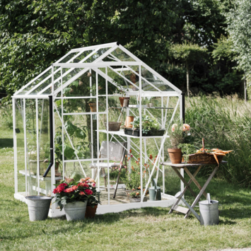 La serre de jardin Kate de Royal Well est une belle serre pratique avec un toit pointu et une porte coulissante. Le verre de sécurité de 3 mm d’épaisseur est solidement fixé avec du ruban mousse amortissant à l’intérieur et des bandes de vitrage en PVC à l’extérieur, faciles à installer et assorties à la couleur des profilés. La fondation intégrée de la serre Kate assure une entrée confortable. Attention! Si vous placez la serre sur un sol non pavé, n’oubliez pas de commander des ancres de fondation supplémentaires de la couleur du cadre. La serre est équipée de gouttières, complètes avec deux tuyaux de descente, pour recueillir facilement l’eau de pluie. Avec une hauteur de faîtage de 214,5 cm, cette serre offre une hauteur de travail confortable, vous permettant de cultiver facilement.