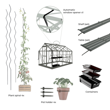 Avec un kit Full Option pour la serre Mary, vous avez tout ce qu’il faut pour démarrer immédiatement. Ce kit comprend une étagère intégrée, une table, 4 porte-pots assortis à la couleur de la serre, des conteneurs (2x 15 litres et 1x 40 litres), 4 spirales à tomates noires et un ouvre-fenêtre automatique. Vous disposez ainsi de tous les accessoires nécessaires pour commencer immédiatement dans la serre Mary. Idéal ! De plus, à l’achat d’une serre avec cet ensemble complet, vous bénéficiez de 15% de réduction sur les accessoires inclus.