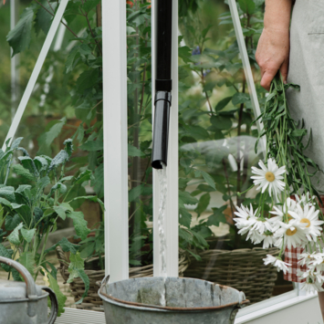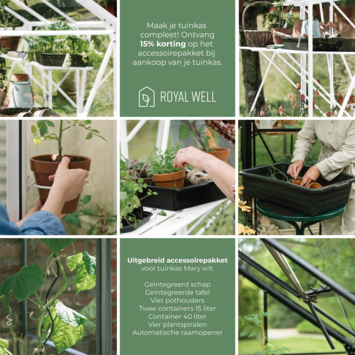 Avec un kit Full Option pour la serre Mary, vous avez tout ce qu’il faut pour démarrer immédiatement. Ce kit comprend une étagère intégrée, une table, 4 porte-pots assortis à la couleur de la serre, des conteneurs (2x 15 litres et 1x 40 litres), 4 spirales à tomates noires et un ouvre-fenêtre automatique. Vous disposez ainsi de tous les accessoires nécessaires pour commencer immédiatement dans la serre Mary. Idéal ! De plus, à l’achat d’une serre avec cet ensemble complet, vous bénéficiez de 15% de réduction sur les accessoires inclus.