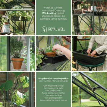 Avec un kit Full Option pour la serre Mary, vous avez tout ce qu’il faut pour démarrer immédiatement. Ce kit comprend une étagère intégrée, une table, 4 porte-pots assortis à la couleur de la serre, des conteneurs (2x 15 litres et 1x 40 litres), 4 spirales à tomates noires et un ouvre-fenêtre automatique. Vous disposez ainsi de tous les accessoires nécessaires pour commencer immédiatement dans la serre Mary. Idéal ! De plus, à l’achat d’une serre avec cet ensemble complet, vous bénéficiez de 15% de réduction sur les accessoires inclus.