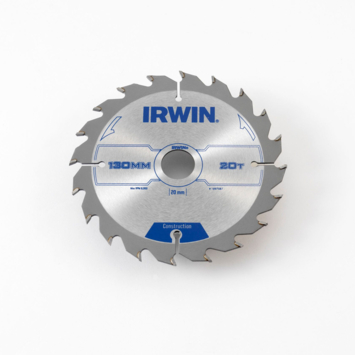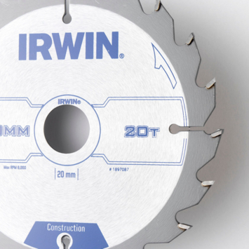 La lame de scie circulaire Irwin IW1897087 est une lame de scie T.C.T. d'un diamètre de 130 mm avec trou d'axe de 20 mm. Les dents grossières (20D) permettent de scier les plaques de bois plus rapidement, mais la finition est un peu rugueuse. La lame a une fine coupe de scie (2,5 mm) avec des dents EVO alternées pour un sciage encore plus rapide. Les pointes en carbure de qualité industrielle restent affûtées longtemps et durent plus longtemps.
