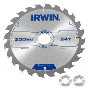 La lame de scie circulaire Irwin 1897201 est une lame de scie d'un diamètre de 200 mm et d'un alésage de 30 mm. 2 bagues de réduction sont incluses, avec lesquelles vous pouvez régler le trou d'axe à 20 et 16 mm. Dents grossières (24D). La lame a un trait de scie fin avec des dents EVO alternées pour une coupe encore plus rapide. Les pointes en carbure de qualité industrielle restent affûtées plus longtemps et durent plus longtemps.