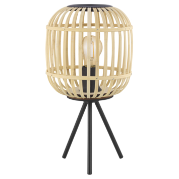 La lampe de table Bordesley de Eglo pour l'intérieur combine un trépied noir avec un abat-jour en rotin coloris naturel. L'abat-jour a 25 cm de diamètre, la lampe de table a une hauteur totale d'environ 40 cm et dispose d'un cordon de 110 cm. L'ampoule E27 n'est pas fournie, préférez une ampoule LED !