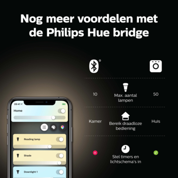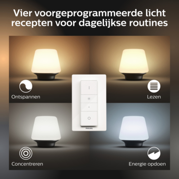 Avec son élégant ballon blanc opale posé sur un pied noir, la lampe à poser Philips Hue Wellness ne manquera pas d'embellir la pièce. La lampe LED White Ambiance produit une lumière blanche déclinée en pas moins de 50 000 teintes. Vous pouvez la commander avec l'application Hue ou l'interrupteur à variateur Hue fourni. Passez en toute simplicité d'une recette lumineuse préprogrammée à l'autre et laissez-vous accompagner au réveil, pendant une lecture ou un moment de détente, pour vous concentrer ou pour refaire le plein d‘énergie. Bien entendu, vous pouvez aussi régler l'intensité de votre lampe ou l'allumer et l'éteindre. Vous souhaitez découvrir encore plus de fonctions intelligentes, telles que la personnalisation des ambiances, les minuteries et les routines ? Dans ce cas, connectez-vous à la lampe avec le Philips Hue Bridge.