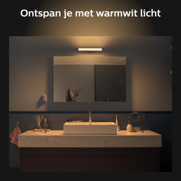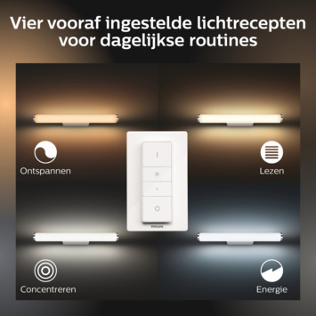 Cette petite applique murale Philips Hue Adore White ambiance s'intègre parfaitement dans n'importe quelle salle de bains. Vous pouvez facilement passer d'une lumière LED blanche chaude à une lumière blanche froide à l'aide du variateur de lumière sans fil fourni. Réglez la lumière comme vous le souhaitez ou choisissez l'une des recettes lumineuses préconfigurées: "Tonus", "Concentration", "Lecture" ou "Détente". Vous aurez toujours l'éclairage parfait adapté aux activités du moment. Lumière blanche froide pour le travail, le rasage ou le maquillage, par exemple. Ou alors, réglez sur lumière blanche et chaude pour transformer votre salle de bain en espace bien-être après une journée bien remplie. Vous pouvez placer le luminaire étanche horizontalement au-dessus de votre miroir ou en placer deux verticalement de chaque côté et obtenir à la fois un éclairage fonctionnel et d'ambiance.